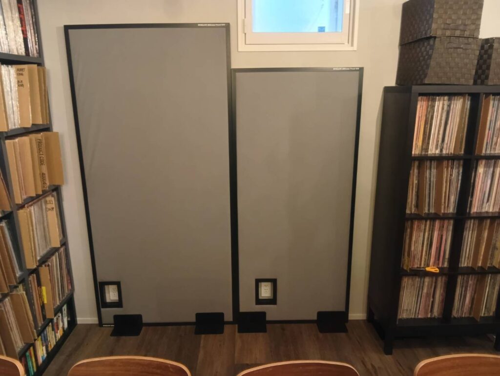 移転後、ALTEC A7(スピーカー)の本領を発揮させるべく、まずフェーズメーション(Phasemation)の真空管パワーアンプMA-1500 、パッシブ・プリアンプCM-1500を導入、続いて今回、ビクター音楽産業時代からの大先輩、靑野浩史さんと元BMG/元スマイルカンパニーの西荻窪住人、内田宣政さんのご紹介で録音エンジニア/音楽家のオノ セイゲンさんと繋がり、この度、厚さ40ミリの強力な吸音材、SHIZUKA Stillness Panel SDM を設置いただきました。